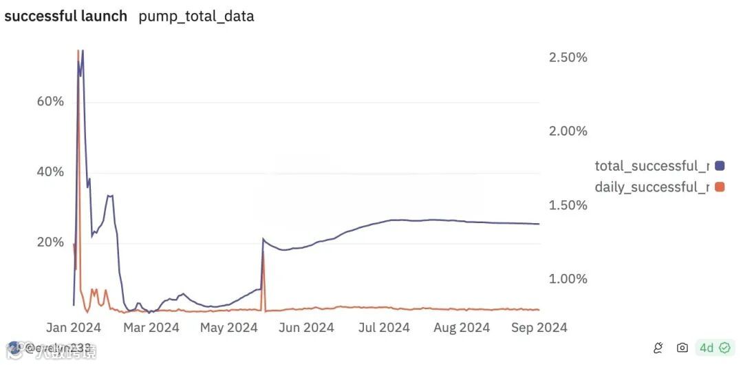 另一个关键统计数据显示,某些平台(如 Solana 的 Pump.fun)上 98.6% 的模因币甚至未能成功推出。这反映了创建模因币是多么容易,但也反映了将其推向市场和保持长期价值的挑战