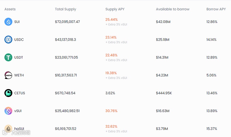 正如我之前提到的,与简单地将它们与 Sui 的验证者之一原生质押相比,简单地持有 $vSUI 或 $haSUI 实际上会为您赚取更少的回报,但是使用 LSD,您可以通过不同的 DeFi 协议提供它们和利息,最好的地方之一是 Navi——一种借贷协议,不仅可以在您的 $SUI-LSD 上为您赚取可观的回报, 但在其他稳定币上也是如此: