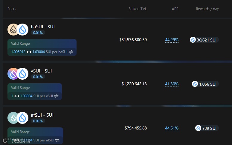 如上图所示,您目前可以通过提供$vSUI和$haSUI赚取超过 30% 的 APY,但有了$haSUI,您可以赚取更多——如果您将 +5% 的 vSUI 考虑在内,则可多赚取近 3%。