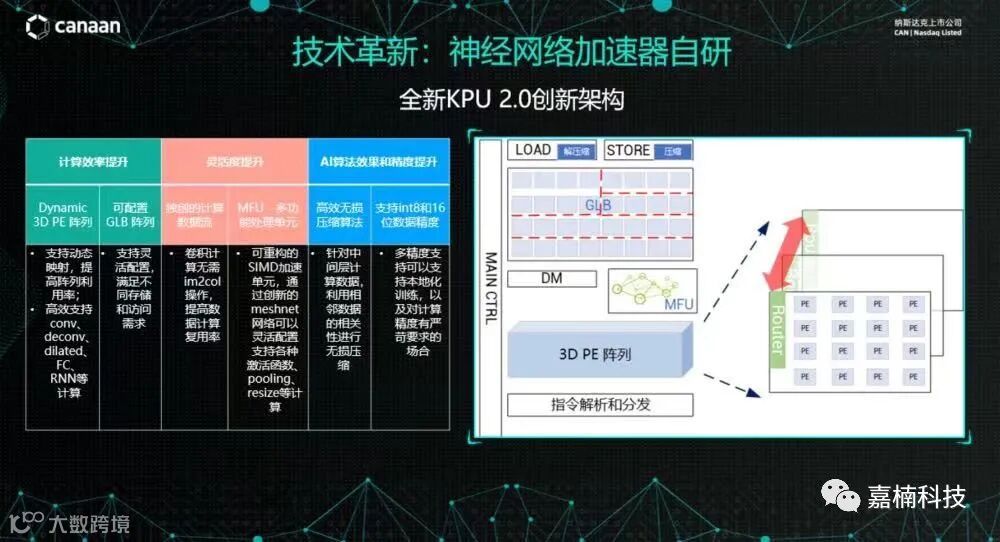 得益于嘉楠自研的计算数据流技术,KPU2.0的计算效率大幅提升,达到2.5TFLOPS/2.5TOPS,分别支持INT8和BF16数据精度运算。相比之下,此前KPU1.0的浮点数运算能力为1.08TFLOPS。