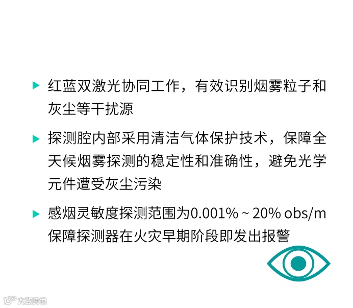 红色激光波长650nm,适用于探测直径1微米至100微米的烟雾颗粒。蓝色激光波长480nm,适用于探测0.01微米至1微米之间的烟雾颗粒,红蓝双激光协同工作,使得西门子 DuoLaser 吸气式感烟火灾探测器既可应用于芯片制造等超净间环境,亦可应用于垃圾处理厂等极具挑战性的工作场合,并可有效将灰尘和烟雾颗粒“分门别类”。