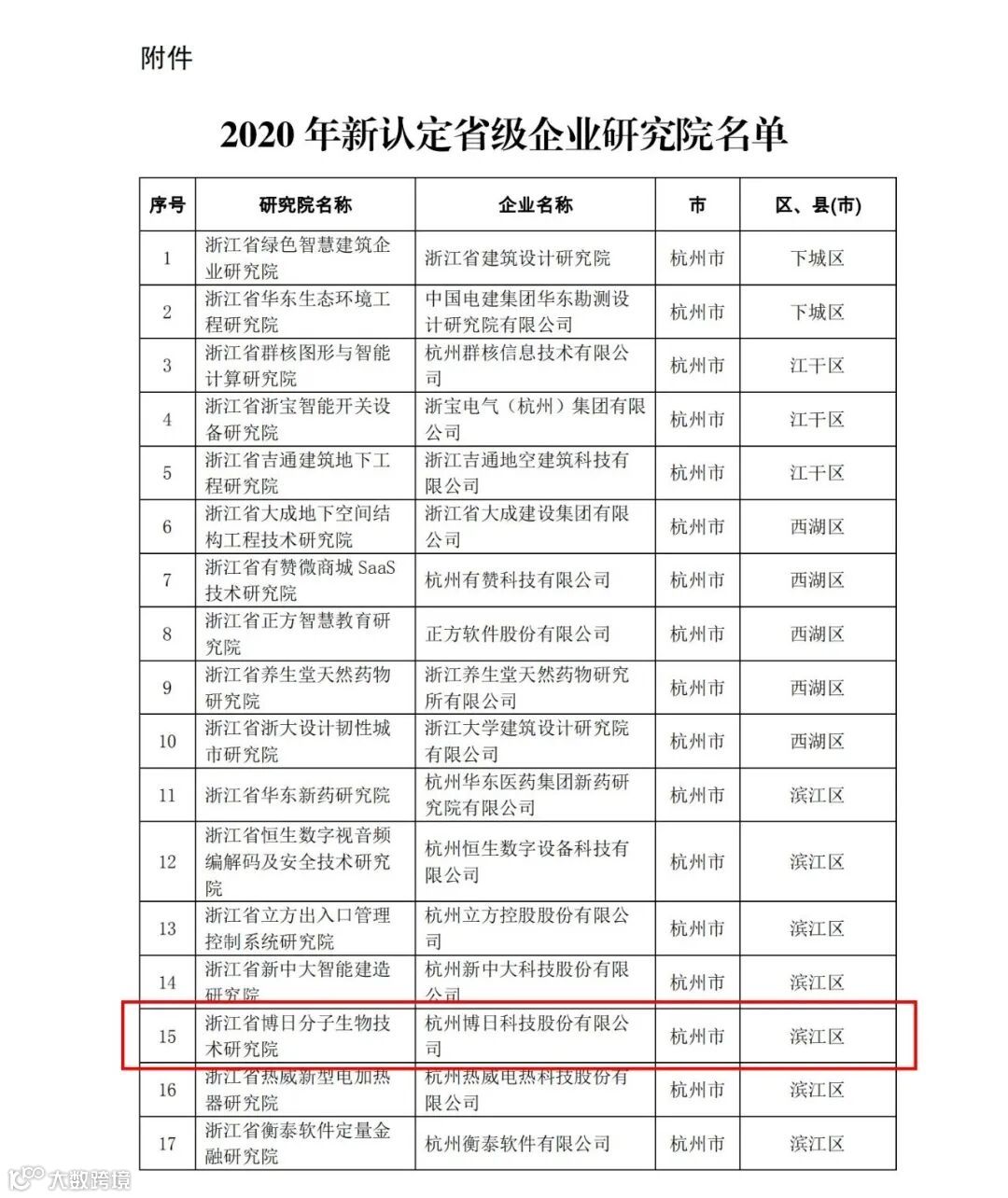 近日,浙江省科学技术厅、浙江省发展和改革委员会、浙江省经济和信息化厅三部门联合发文,根据《浙江省企业研究院管理办法》《浙江省科学技术厅关于组织申报 2020 年省级企业研究院的通知》精神,在各设区市推荐基础上,经评审、公示,公布301家“2020年新认定省级企业研究院”名单,位于杭州市高新技术产业开发区的杭州博日科技股份有限公司旗下的浙江省博日分子生物技术研究院赫然在列。