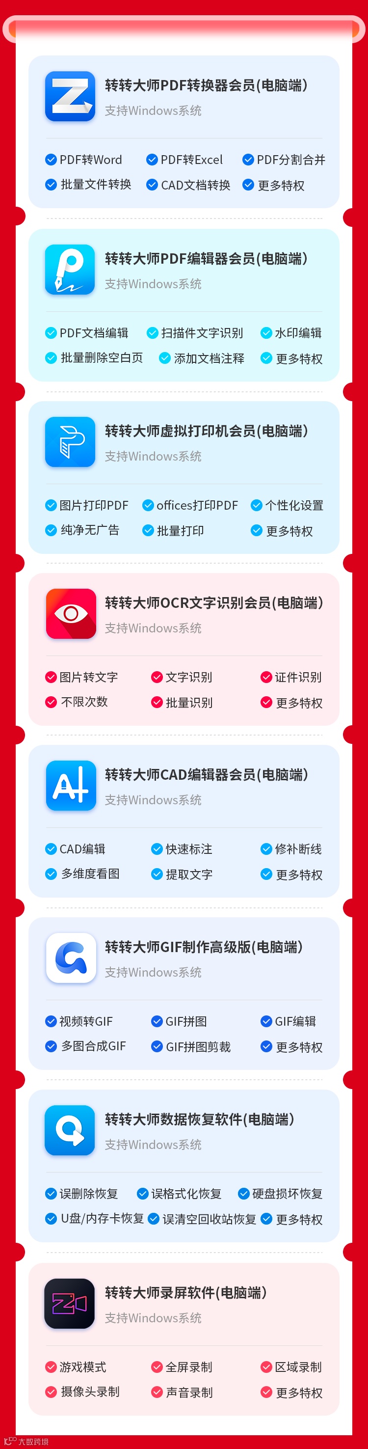 全家桶会员包括:(转转大师转换器+编辑器+OCR文字识别+虚拟打印机+CAD编辑器+数据恢复+录屏软件+GIF制作高级版)电脑端会员。