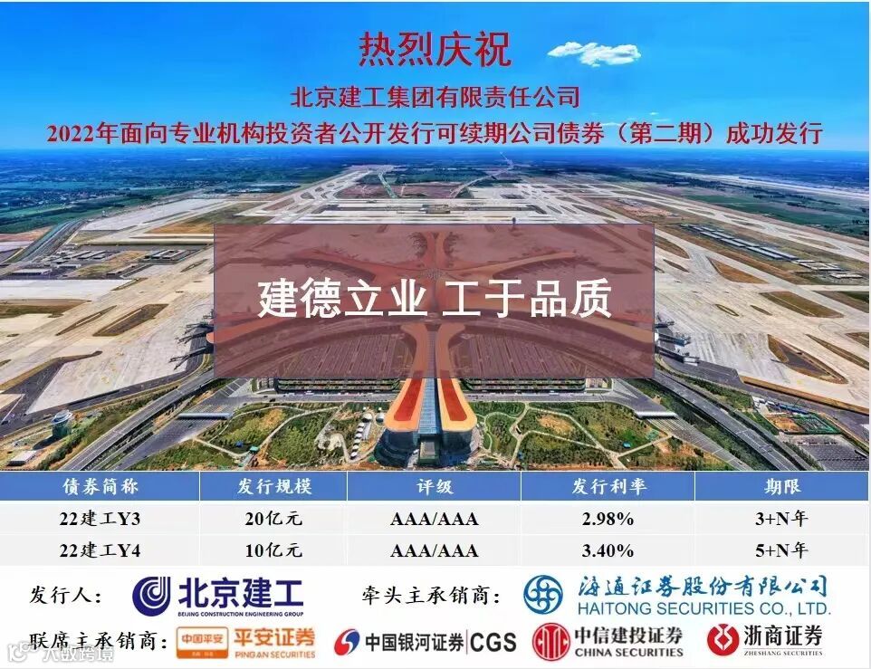 8月12日,中国银河证券联席主承销的“北京建工集团有限责任公司2022年面向专业机构投资者公开发行可续期公司债券(第二期)”完成发行,主体评级AAA,债项评级AAA。品种一(简称:22建工Y3, 证券代码:137634.SH)发行期限3+N年,规模20亿元,票面利率2.98%;品种二(简称:22建工Y4, 证券代码:137635.SH)发行期限5+N年,规模10亿元,票面利率3.40%。