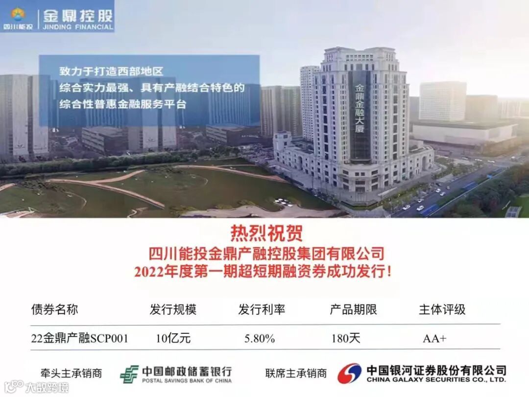 1月20日,中国银河证券联席主承销的“四川能投金鼎产融控股集团有限公司2022年度第一期超短期融资券”(简称:22金鼎产融SCP001,证券代码:012280319.IB)完成发行,发行人主体评级AA+。本期债券发行期限180天,发行规模10亿元,票面利率5.80%。