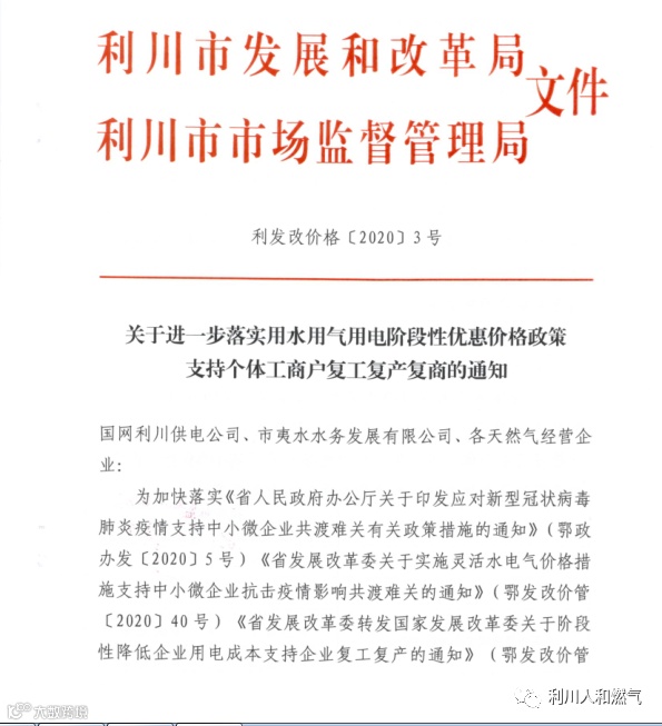 导读:根据利川市发展和改革局和利川市市场监督管理局联合下发,利发改价格【2020】3号文件《关于进一步落实用水用气用电阶段性优惠价格政策支持个体工商户复工复产复商的通知》的相关精神,我公司辖区内天然气用户中