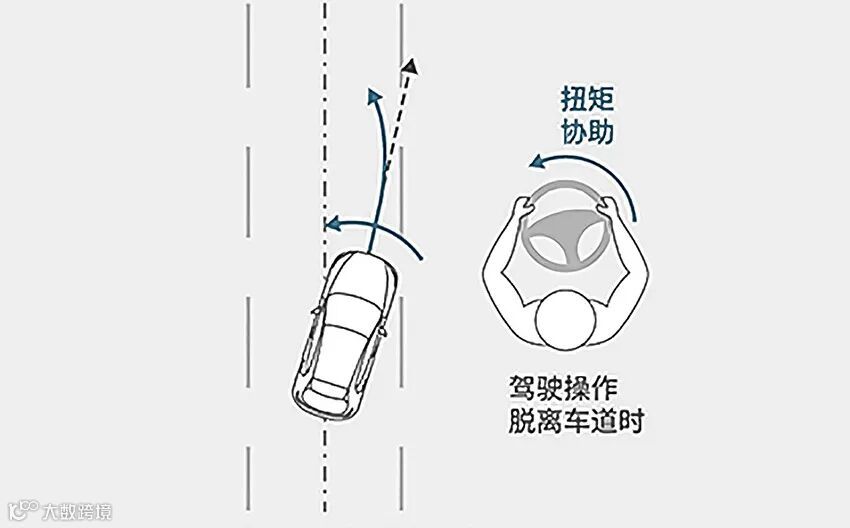 在以约60km/h以上的时速行驶过程中,系统感知车道的白线(或黄线),判断自身车辆有可能脱离了车道的情况下,系统会启动电动转向功能辅助驾驶者操作方向盘。同时会显示在多功能显示屏上告知驾驶者。