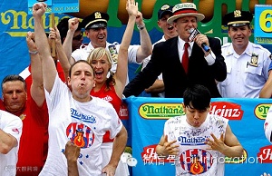 每年7月14日就会在美国Coney Island 举办吃热狗大赛。最新的记录是10分钟内吃掉68个热狗。