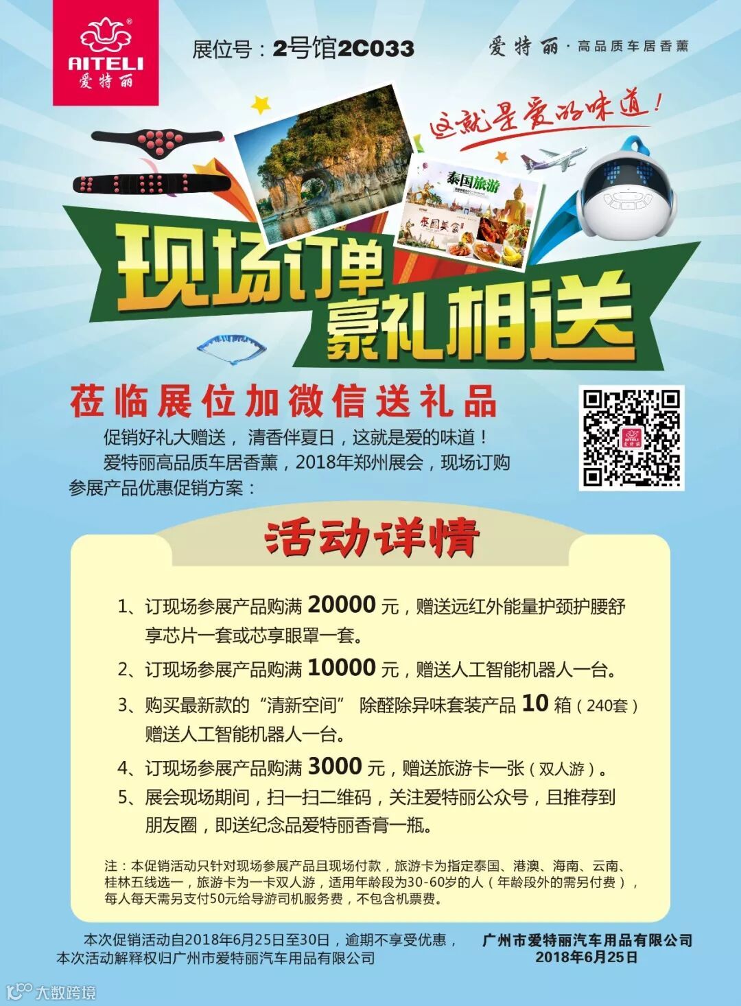 明天开幕,爱特丽车居香薰展位号2号馆2C033,现场有大型优惠促销,订爱特丽产品送健康、送智伴机器人、送旅游卡、莅临展会更有精美纪念品赠送,欢迎围观!