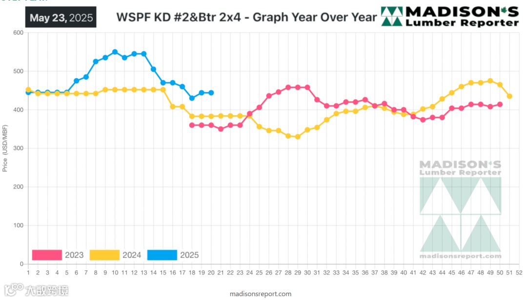 当周价格:截至2025年5月23日,西部云杉-松-冷杉(Western Spruce-Pine-Fir)规格为2×4英寸、等级#2及优等窑干随机长度(2×4 #2&Btr KD RL)的木材价格为444美元/千板英尺(mfbm),与前一周持平。