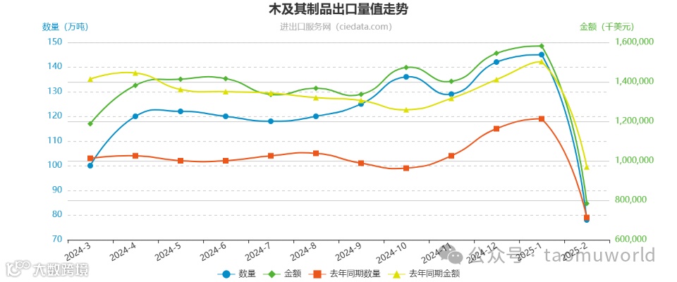 总体来看,2025年初我国木及其制品的进出口情况,进口数量和金额在2025年初有所回升,但仍低于2021年的峰值。出口数量在2025年初有所增长,但出口金额继续下降,显示出出口价格可能有所下降。