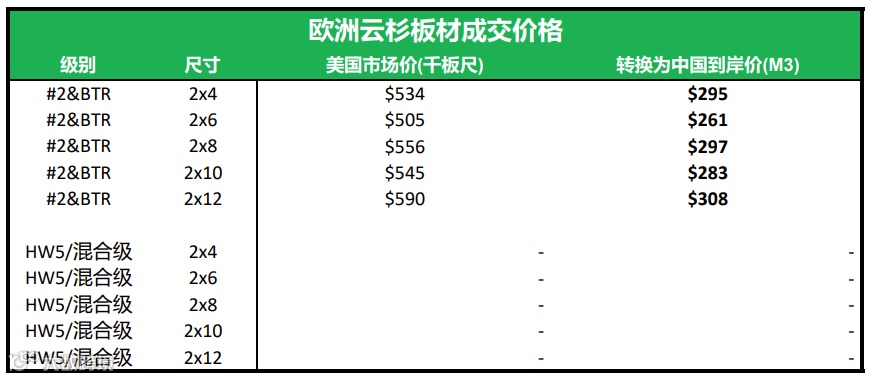 在北美的欧洲云杉价格受到加拿大SPF影响,精选二级2X4和2X6下跌了约2%,其他宽板因为库存有限而没有显著变化。除非出现大批量货物抵港,在美国市场的欧洲云杉价格在近期内没有大起大落的迹象。