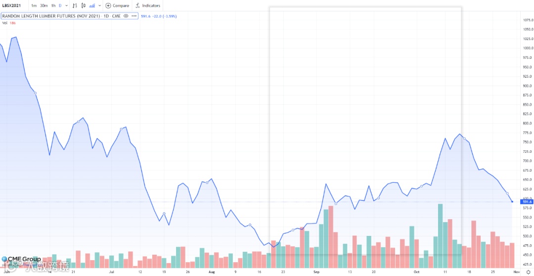 北美木材期货本月经历了过山车般的行情,从10月初的620美元涨至月中的770美元每千板尺附近,随后一路下跌,10月最后一个交易日报收于591.6美元/mfbm,再次跌破600美元。