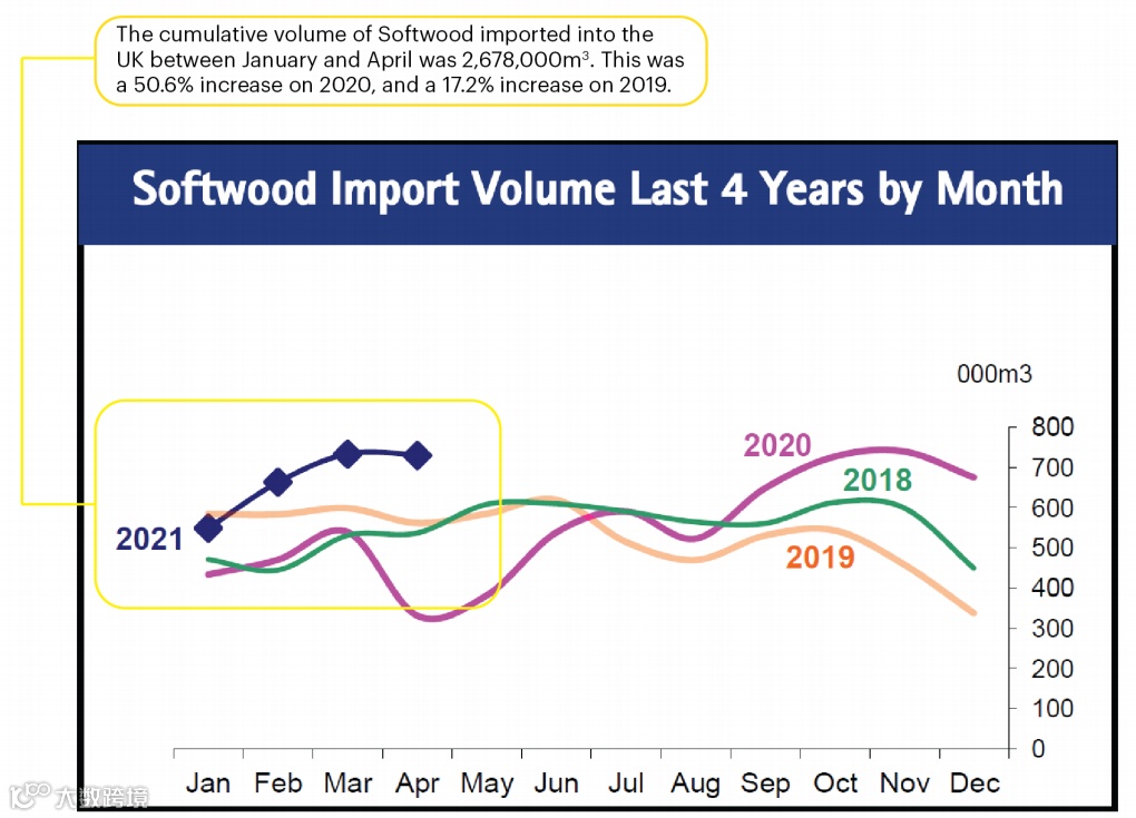 从2020年第三季度到2021年第二季度,英国过去三个季度的木材进口量达到创纪录水平。2020年英国软木进口量将达到660万立方米,超过2019年630万立方米的进口量。2021年1-4月份英国软木进口量为267.8万立方米,同比增长高达50.6%,有疫情影响因素。相比2019年也有近17.2%的增长。