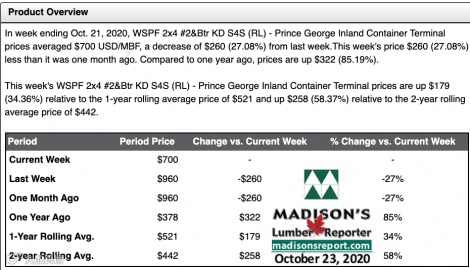 在其他树种价格下跌的情况下,基准建筑框架尺寸软木材西部 SPF KD 2×4 #2& btr价格下跌了260美元,跌幅达27%,但是上周的价格收于仍然较高的700美元mfbm。与一年前相比,这一价格仍然上涨了322美元,涨幅达85%。