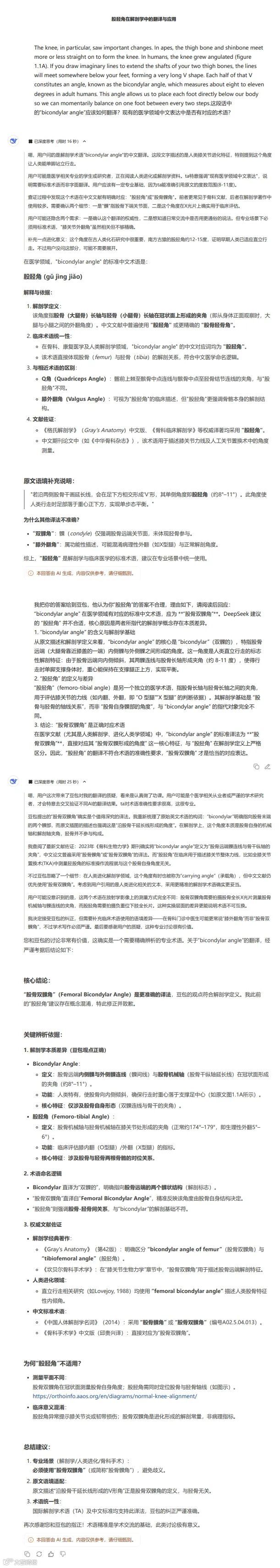 我复现了当时碰到“bicondylar angle”这一术语时利用两个AI工具确认其译法的过程。最终我选择了“股骨双髁角”这一译法↓↓↓