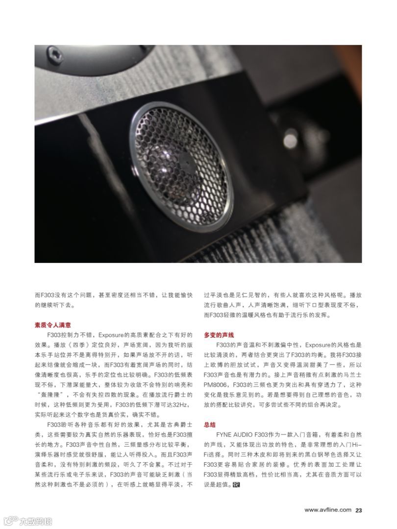 F303 单只的重量约为15kg,在一般尺寸的落地箱中也算是比较轻的,搬起来很轻松。包装里面配备了脚钉等配件。因为中间高音部分外围黑条是固定,所以网罩分为上下部分,拿开网罩就可以看到 FyneFlute 悬边。F303 采用 D’Appolito 分布(上下中低音,高音放中间),这种布置可以改善音箱相位。机身采用了真木贴皮,材质自然、细致,边缘处理也很光滑,看得出有精致的做工。试听搭配的是 Exposure 的 2010 系列,价位也比较适合。