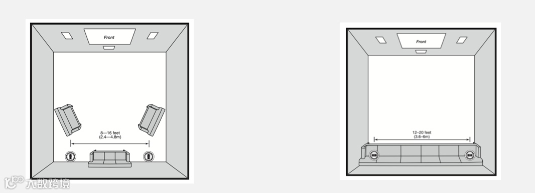 右图 : 位于座位的后方,聆听漫反射声的效果, 高音指向墙壁. 通过反射声再传到聆听位, 这种安装方式, 环绕声音包围感较强, 定位偏弱于直达声.