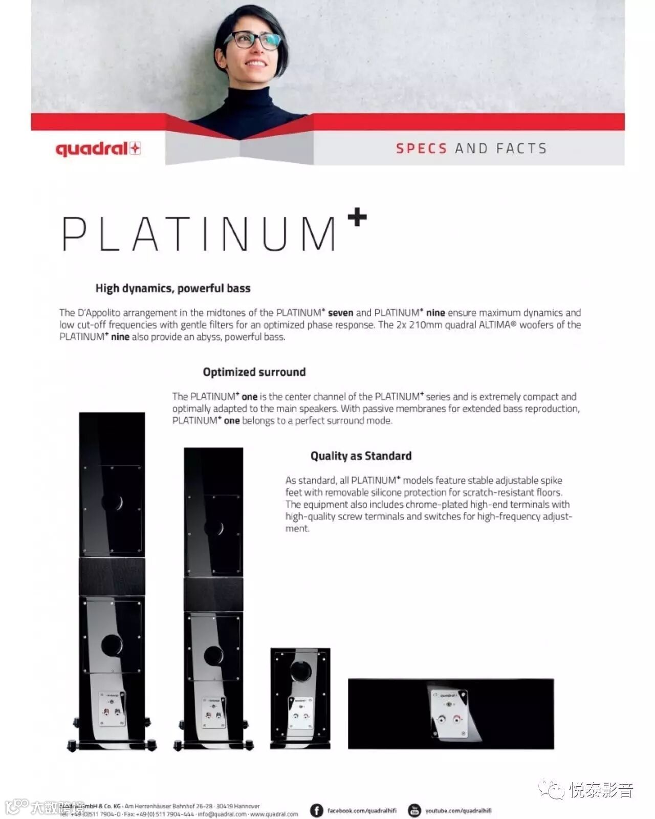 以 D'Appolite 对称呈现的中低音喇叭单元排列方式 ( 用在落地音箱 Platinum+ 9, 7 ), 确保最大的动态, 柔和滤波器的低频截止, 保证最佳的相位响应. 双 8.3" 的 Platinum+ 9 提供强而有力的低频能量.