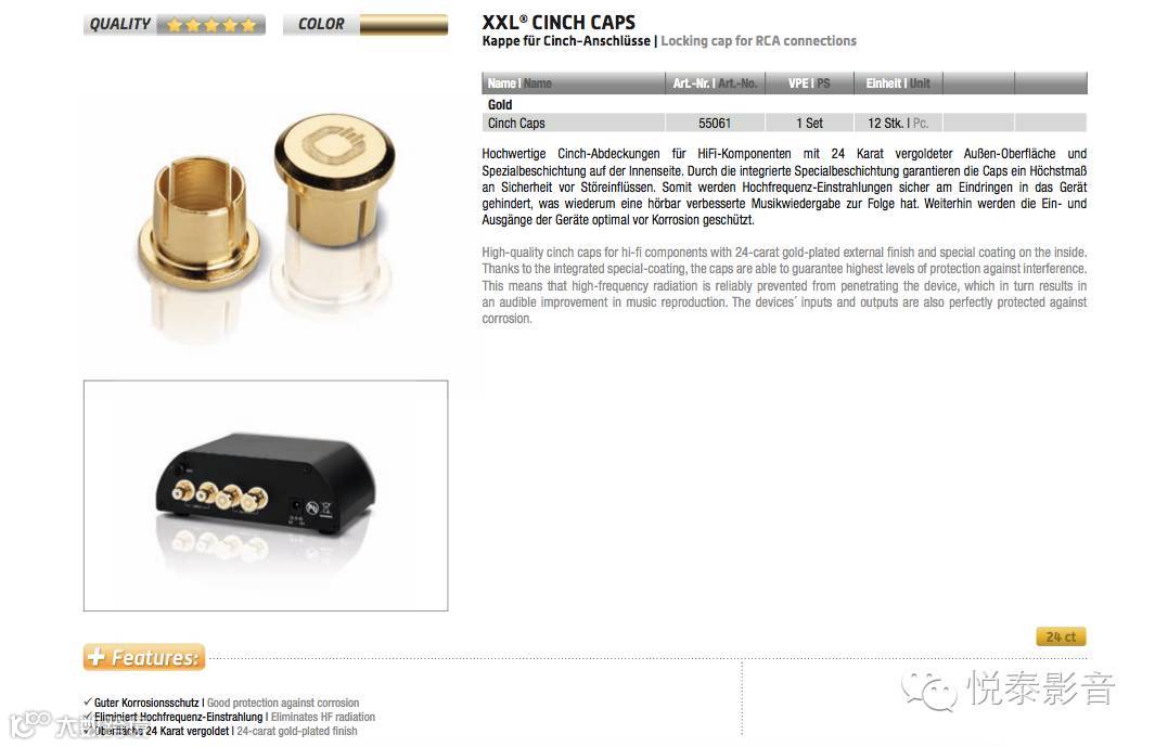 外层 24K 金镀金涂布, 及内层特殊材质涂布, 让这个 RCA 盖帽能够保证最高层级的保护设备, 防止干扰; 这也代表它可以有效的防止高频辐射, 在声音的重现上可以达到明显的改善效果.