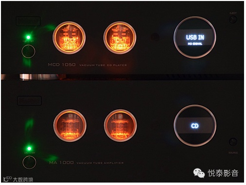 MCD1050 是一台设计简洁,格调别致并且带电子管输出的 CD 播放机。外观上节约精致,黑色的铝合金面板表面以拉丝处理,左面有两个圆形小窗外圈镶嵌着镀铬的装饰圈,透出里面悠悠的电子管灯丝光芒。若晚上关灯聆听,橙黄色的灯光定能带来暖入人心的感觉。面板中间的圆窗则是资讯状态显示屏,虽然显示屏是方形的,但一体的设计也不会给人奇怪的感觉。右侧是数个操控按键和 CD 碟仓,有意思的是,碟仓进出按键设计脱离其它按键,另外,播放/暂停按键也较其它按键大了一圈,还伴以镀铬装饰圈,令操作非常直观而且人性化。