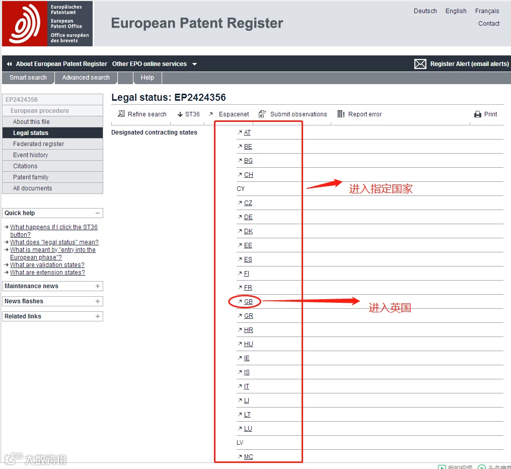 检索示范专利:EP2424356检索进入EPO的检索系统(欧专局):https://register.epo.org/regviewer?lng=en