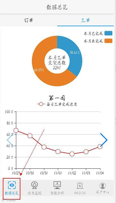 5.登录之后显示主界面菜单,点击左下角“数据总览”可切换‘订单’‘工单’数据。