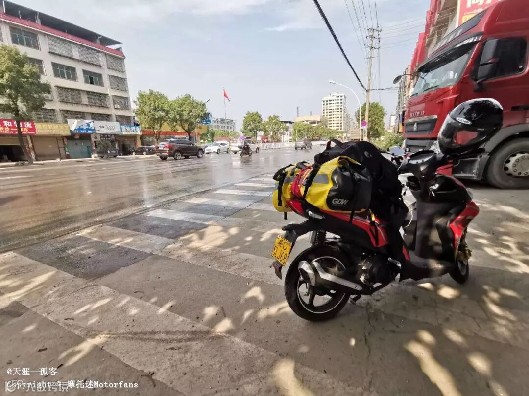 途经祁东,却遇到慢悠悠的洒水车,整个街道都被水柱覆盖,我只好路边停车休息。谁知道再次出发时又碰到那洒水车返回来,这次我荣幸地被淋了一车身的水。