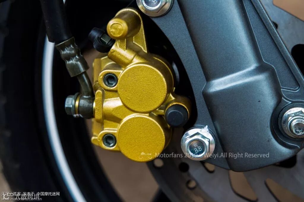 前轮配备220mm碟刹盘以及双活塞卡钳,确保刹车安全性能。