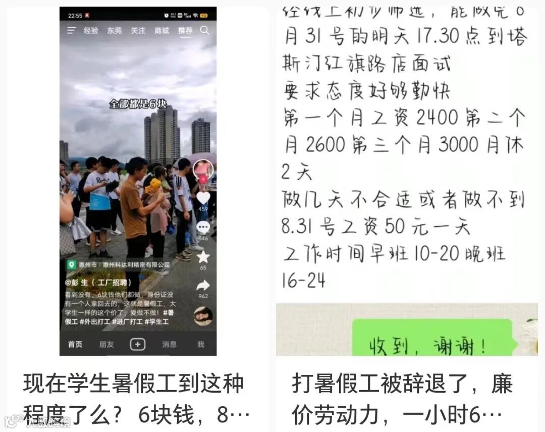 打开各个社交平台,话题下的留言简直就是一部大学生流水线工人的打工血泪史。