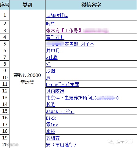 由于小伙伴们对盒子支付的大力支持,我们成功突破20000票大关,所以盒仔也依言抽取了20位幸运粉丝,恭喜他们!