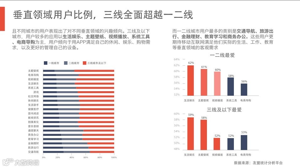 三线城市呈现出巨大的市场潜力,IOS设备与安卓设备的活跃量,在三级城市及以下均反超一、二线城市,中国有近62%的活跃设备在三线及以下城市,接近北、上、广、深4个一线城市活跃设备总量的四倍。
