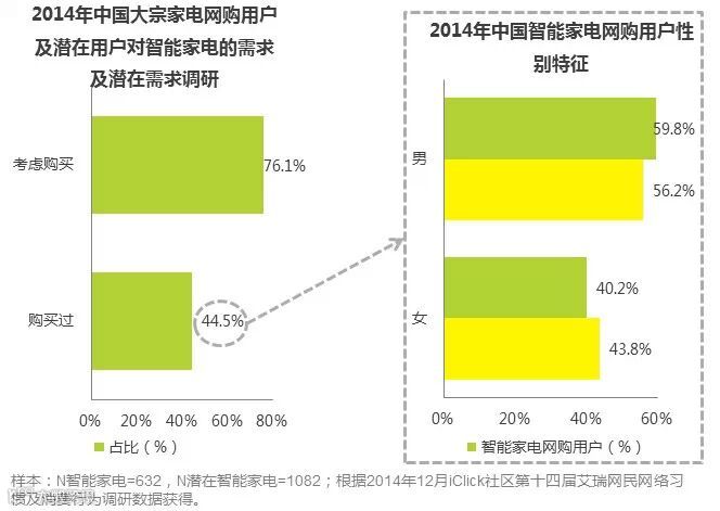 艾瑞针对中国大宗家电网购用户对于智能家电的购买及需求调研发现,其中44.5%的用户在2014年购买过智能家电,而未来考虑购买的用户比例大幅上升,增加至76.1%。此外,对比整体网购用户性别分布发现,当前智能家电网购用户男性占比更高。