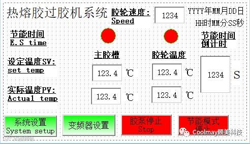 热熔胶机主要用于热熔胶的融化和恒温出胶,主要用在需要长时间稳定供应熔融状态的热熔胶的生产场合,适用于纸尿片生产等类似制品的加工过程。机器需要对胶缸、胶枪和胶管同时进行恒温控制,当温度达到设定值范围后,再启动变频器,变频器搅动熔融状态的热熔胶。使用顾美的触摸屏一体机EX3G-70KH-44MT-16AD-NI120-485P,结构紧凑,集成了16路温度控制,支持NI120类型热电阻,485通信口支持modbus RTU协议的所有功能码,使用方便。