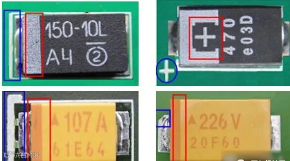 2.2 钽电容有极性。PCB板和器件正极标示:1)色带标示;2)“+”号标示;3)斜角标示。