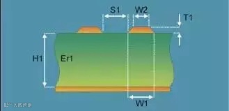 因为差分阻抗影响差分信号的眼图、信号带宽、信号抖动和信号线上的干扰电压。差分线阻抗一般控制在90(±10%)欧姆(具体值参照芯片手册指导),差分线阻抗与线宽W1、W2、T1成反比,与介电常数Er1成反比,与线间距S1成正比,与参考层的距离H1正比,如下图是差分线的截面图。