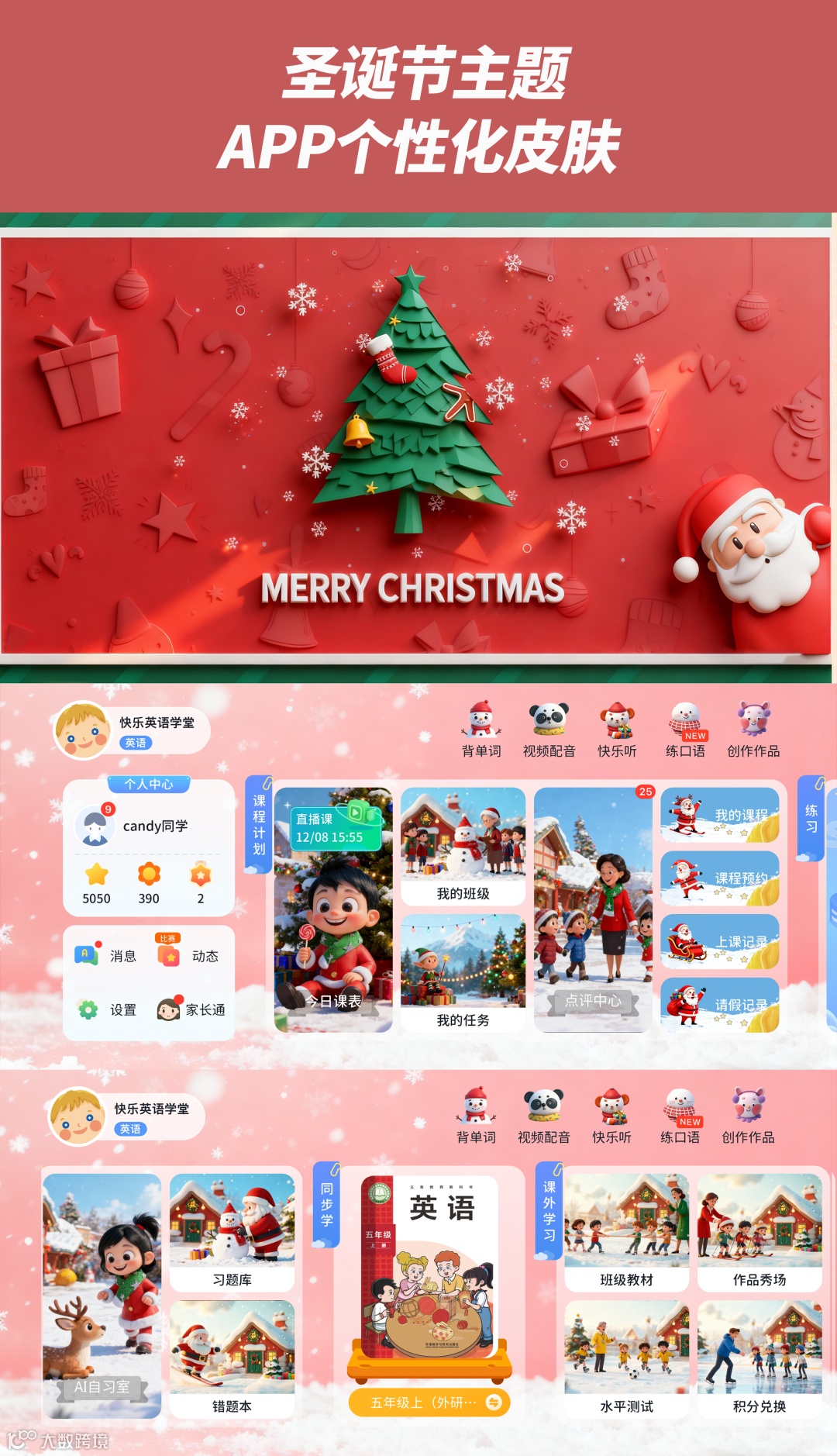 将首页轮播图、课程图标统一更换为圣诞主题风格,家长在打开APP瞬间即可感受到机构的细致与专业,在温馨情绪中更易接受后续沟通内容。