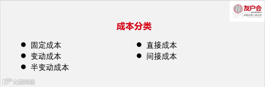 在财务会计中,对于成本有各种不同分类方法。为了满足采购所需的成本分析需要,我们将成本按照其是否随产量的变化分为:固定成本、变动成本、半变动成本。