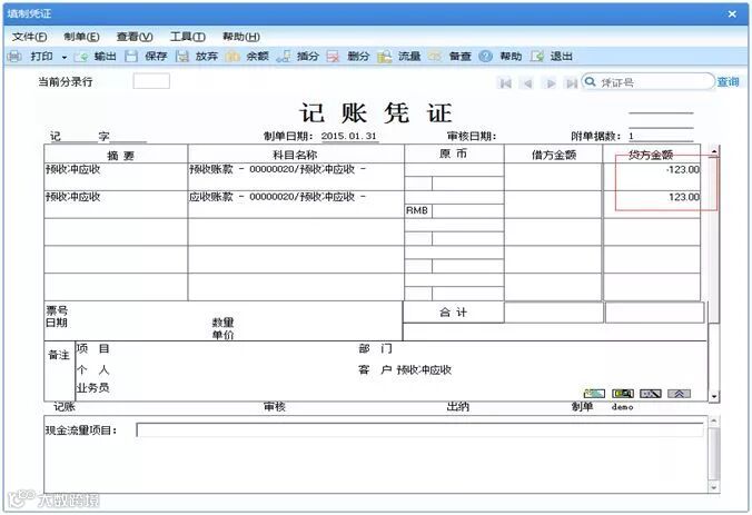 3.分别应收款和预收款页签录入转账金额,若全额冲抵,可以双击原币余额这行,可以自动带出转账金额。输入转账金额后点确定,则会提示是否立即制单。点是生成贷:预收账款 -123 贷:应收账款 123的预收冲应收凭证。或者点否后到应收凭证处理-生成凭证中选择预收冲应收制单。