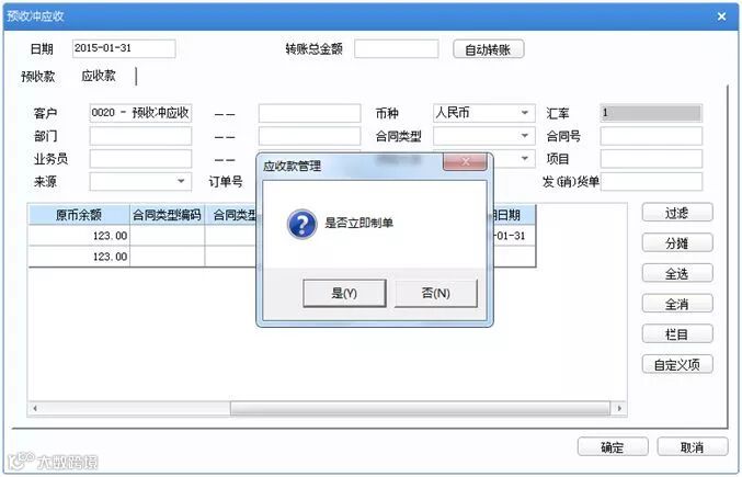 3.点确认提示是否立即制单,点是生成借:应收账款 预收冲应收客户 -123,借:应收账款 应收A客户 123.或者点否后在凭证处理-生成凭证选择应收冲应收制单。