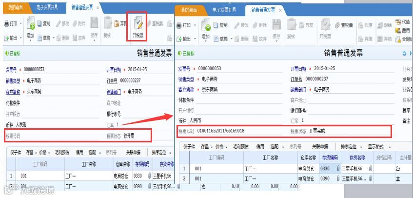 在销售管理的销售发票界面,点击“开税票”,自动推送到发票管理生成电子发票,并推送发票至邮箱、短息等;同时支持批量开具发票,开票完成后将电子发票的发票号码、发票代码、发票日期回写到发票管理的发票中;当然,开具纸质发票业务、打印电子发票票和纸质发票功能也必不可少。