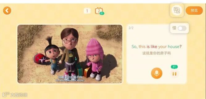 翻译:可隐藏中文翻译,沉浸式配音;显示中文翻译,边配音边学单词,有效积累词汇量。