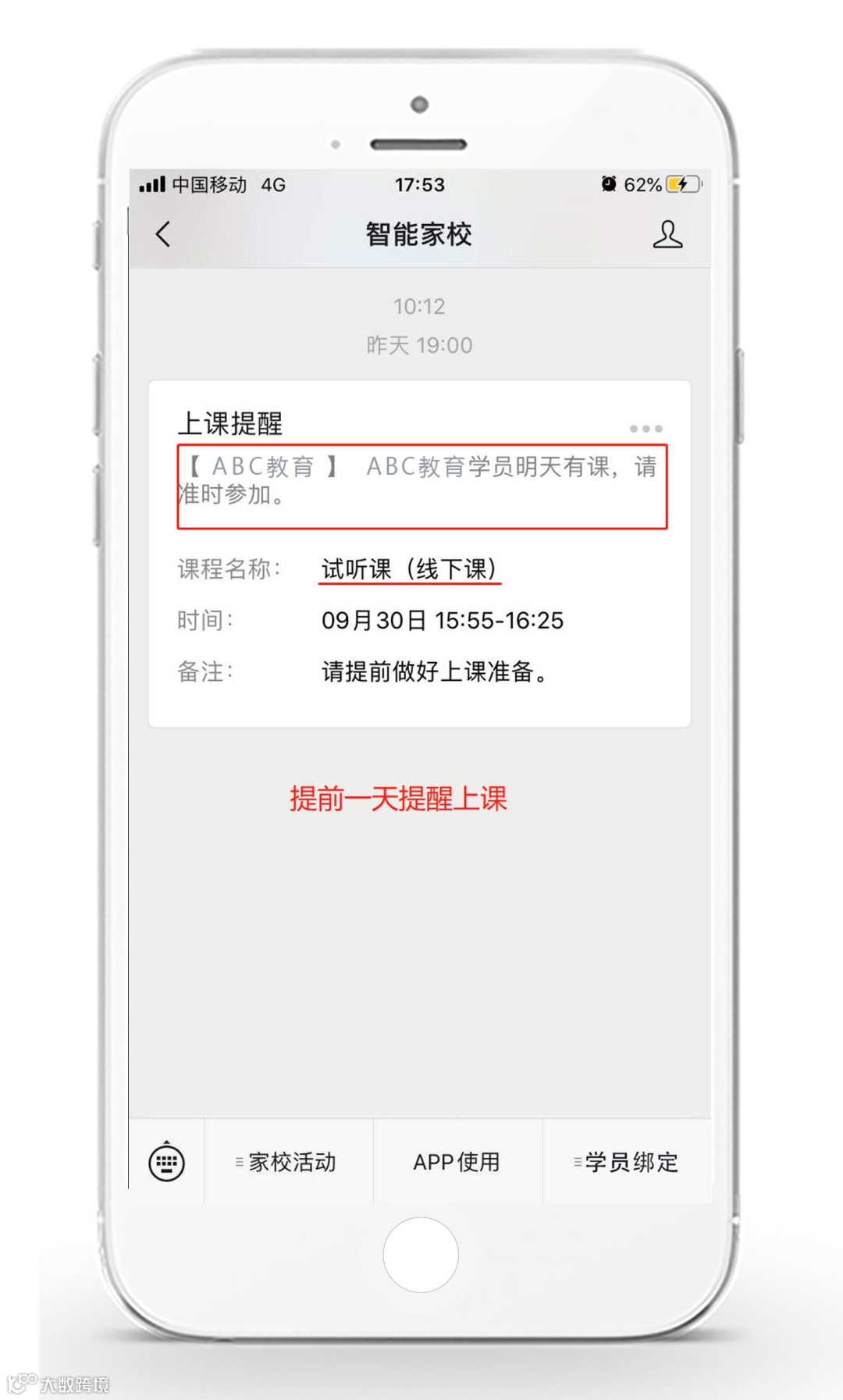 老师通过APP或学校后台进行排课后,公众号会自动在上课前一天和上课前30分钟向参与课程的学员发送一条上课提醒。