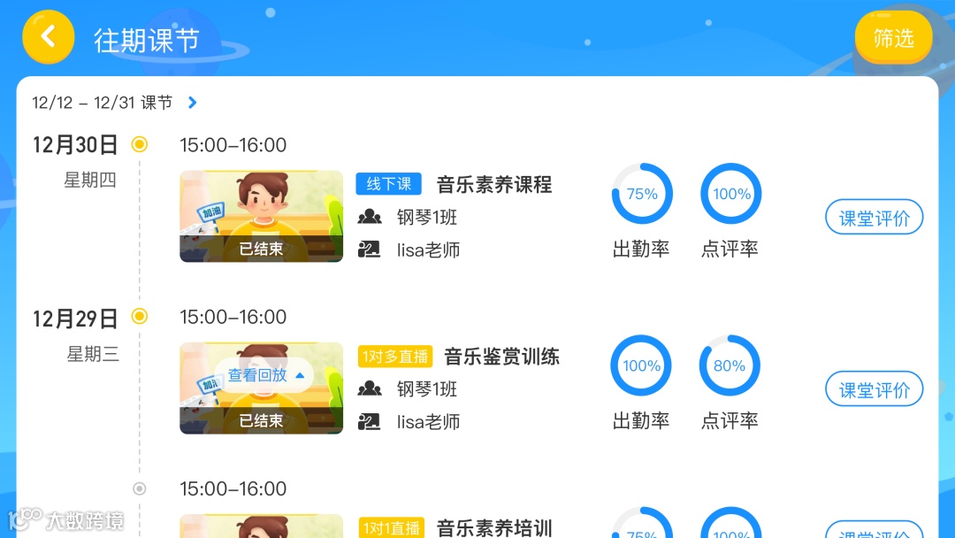 丰富的课节内容,让老师能快速查看课堂教学数据,辅助老师课后教学工作。做到可以随时查阅往期上课的历史记录,查看已结束课程的出勤率和点评率。
