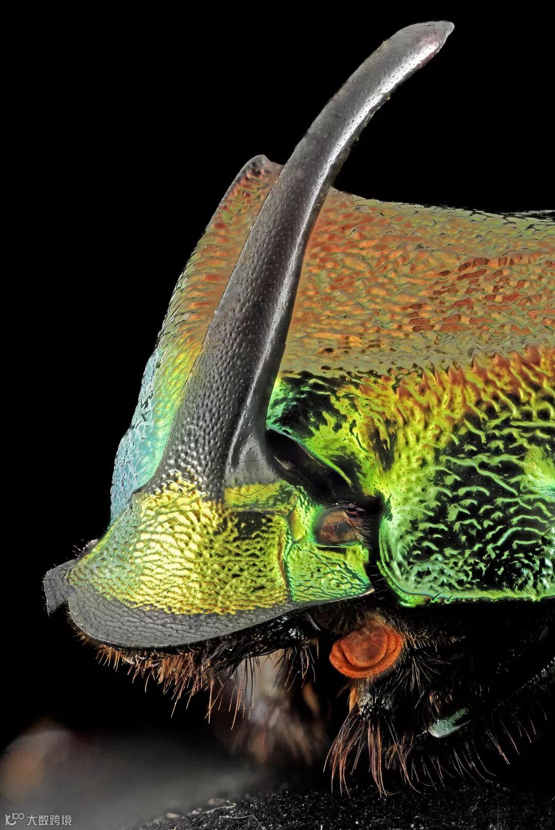 金属色和不成比例的大角,是雄性彩虹锹甲虫的显著标志。