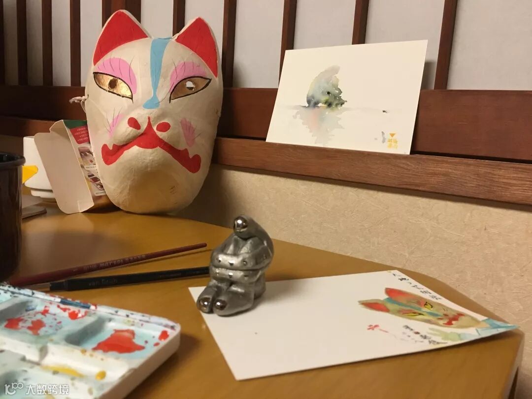 纸色平实,用颜料寥寥数笔点成个狐狸面,比例停匀得当,配色精炼明媚,质感温暖,过目难忘。