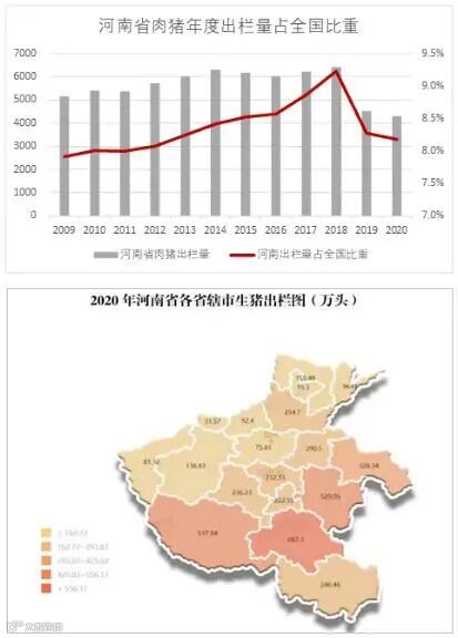【调研背景】河南省是我国重要的生猪养殖和调出大省,2020年河南省生猪出栏4311.2万头,较2019年下降4.2%,较正常年份(2017年)下降了30.7%,仅次于四川(5614.4万头)和湖南(4658.9万头)。河南省每年外调活猪和猪肉合计折合生猪在1700万头以上。分区域看,河南各地区均有生猪养殖,但豫南地区相对最为集中。2020年驻马店、南阳、周口三地生猪出栏量共计1734.3万头,占河南省总出栏量的40.2%,而2018年非洲猪瘟爆发前,这个数字常年维持在34%~35%左右。