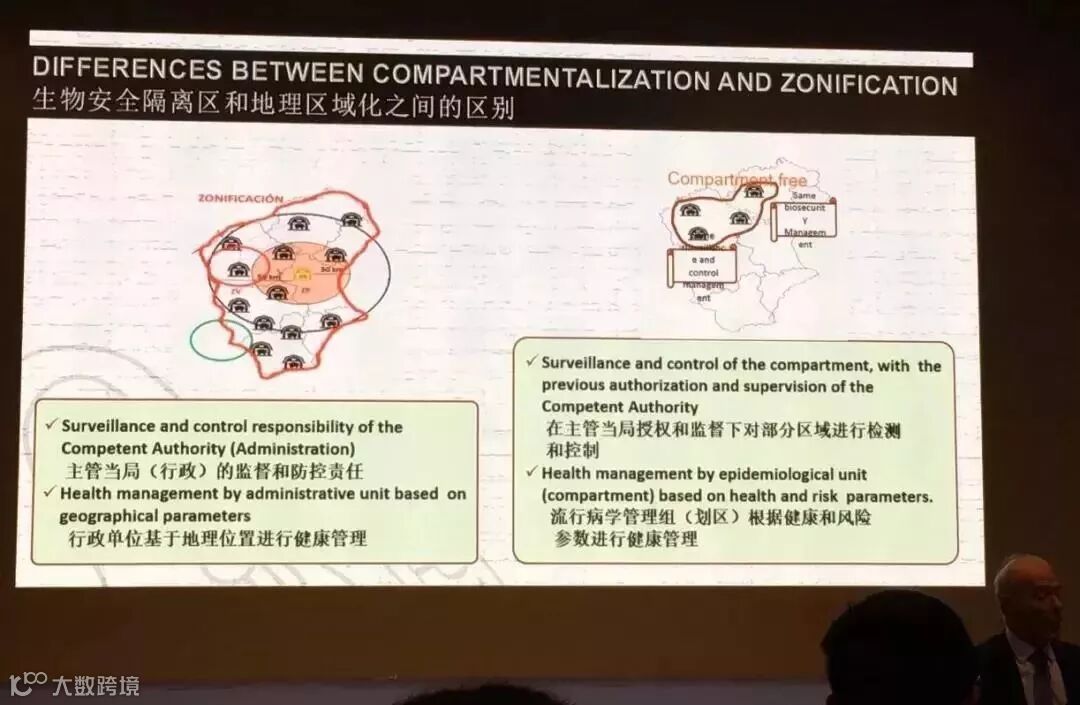 例如有几家农场,没有集中在某个省或者某个州,而是遍布在国家的各个区域。但是,这几个农场会共享在同一生物安全体系内:他们拥有相同的管理体系,饲料来源,共用的屠宰场,共用运输车辆等。在国内来说就是集团化养殖企业。
