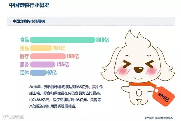 其中,宠物狗市场规模2018年底达到了985亿元。包括主粮、零食和保健品在内的食品类占比最高,达到了383亿元,宠物狗医疗市场规模达到了198亿元,用品为151亿元,美容寄养等服务类市场规模也有156亿元,活体为97亿元。