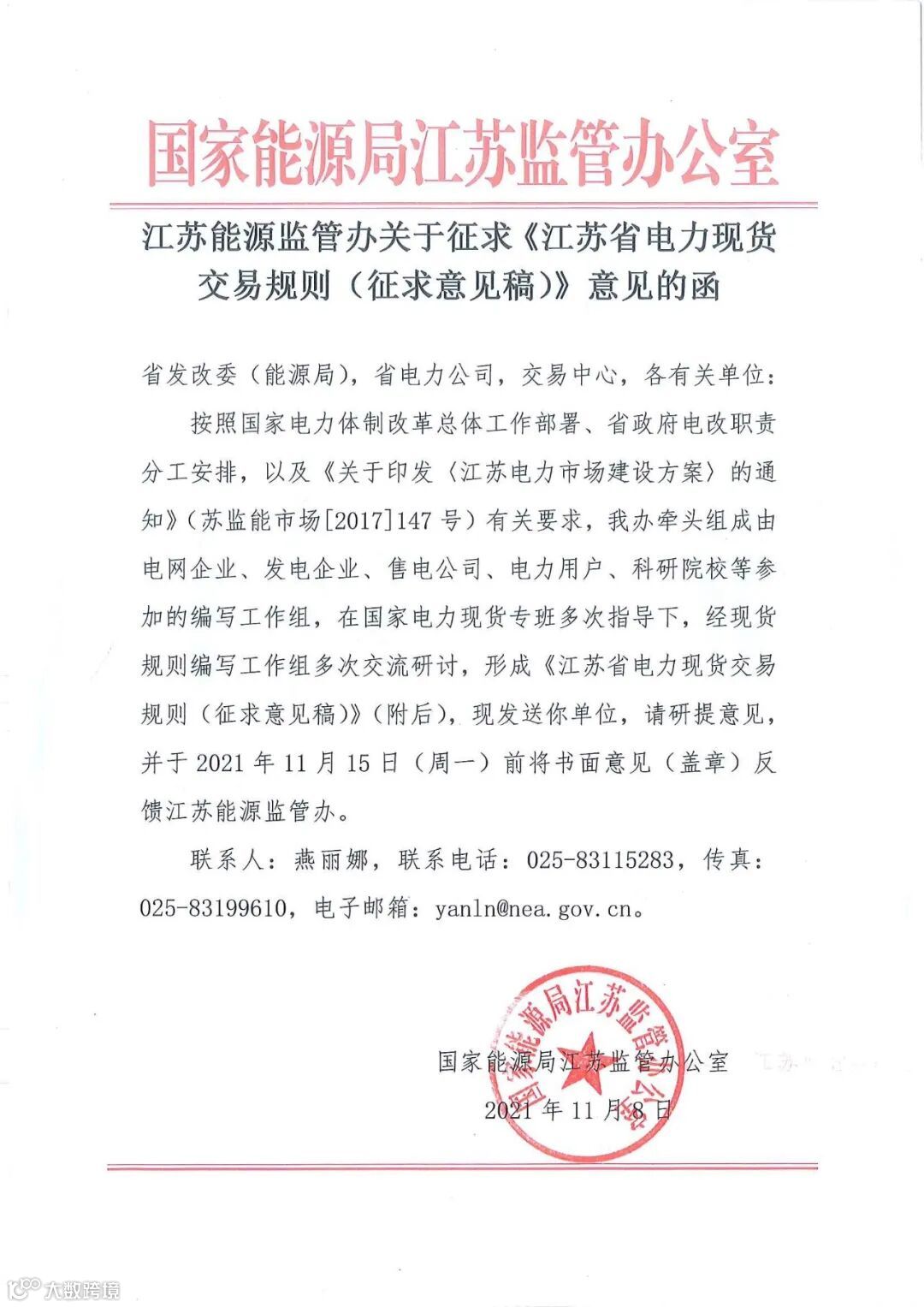 11月8日,国家能源局江苏监管办公室江苏能源监管办印发关于征求《江苏省电力现货交易规则(征求意见稿)》意见的函,由省发改委(能源局),省电力公司,交易中心,各有关单位于11月15日前反馈意见。本次征求意见稿,包含市场成员、日前市场运行、实时市场运行、辅助服务市场、中长期市场与现货市场的衔接、计算和结算、信息披露、风险防范、信用管理、市场监管等内容。